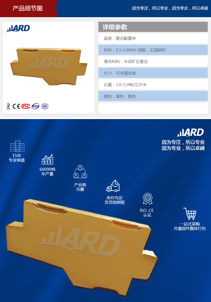 品類:復(fù)合配重塊 外殼材質(zhì):0.5-0.8MM 鋼板,五面鋼板 填充材料:水泥礦石復(fù)合 尺寸:可來圖定制 比重:3.0-5.0噸/立方米 顏色:黃色,黑色
